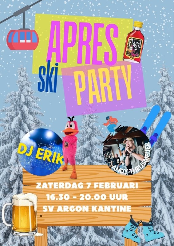 Het is weer tijd voor een ouderwets gezellig feestje! Trek je warmste wintersportoutfit aan en kom zaterdag 7 februari naar de SV Argon kantine voor een knallende après-ski party.