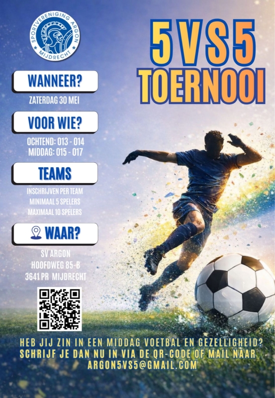 5-5 toernooi voor de jeugd van 13 t/m 17 jaar, op zaterdag 30 mei.