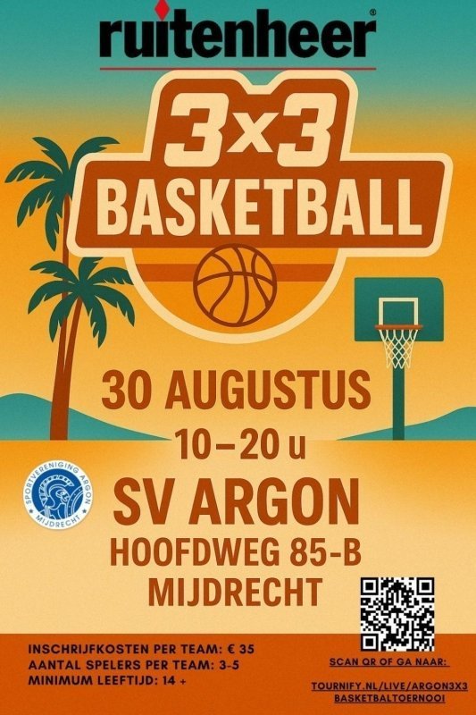 Het evenement staat symbool voor de saamhorigheid binnen SV Argon en biedt een laagdrempelige manier om kennis te maken met basketbal in de vorm van het dynamische 3x3-format. Teams bestaan uit drie spelers in het veld, met maximaal vijf spelers per team. Zowel ervaren basketballers als enthousiaste beginners zijn welkom. Inschrijven kan vanaf nu via deze QR-code.