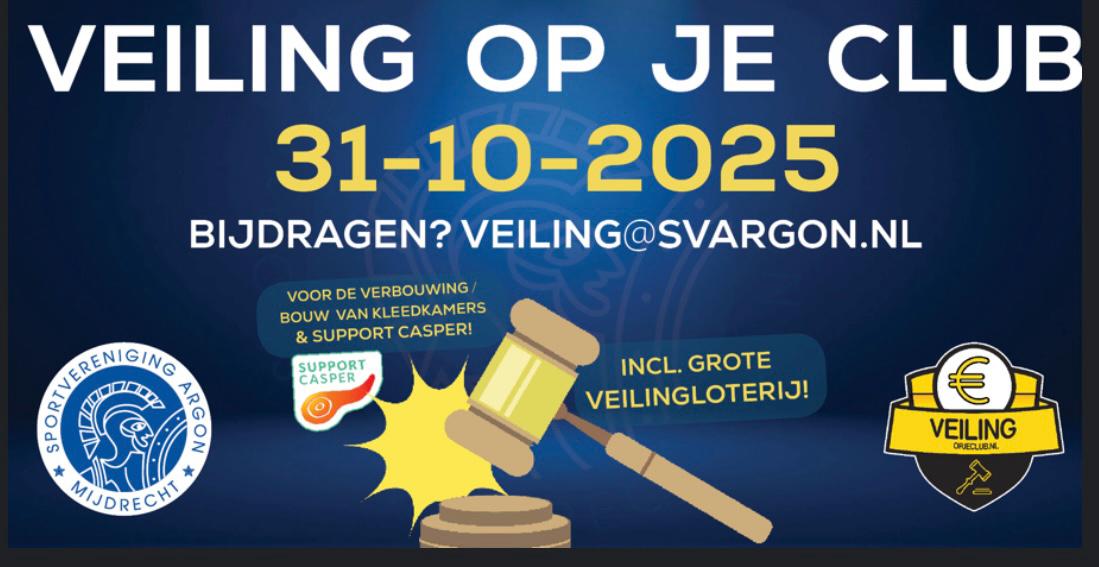 Op vrijdag 31 oktober staat de eerste grote Veiling op je club bij SV Argon gepland! De voorbereidingen zijn al even in volle gang. Dit is nou zo’n avond die je niet wilt missen! Een echte clubavond met verrassend entertainment, hapjes en drankjes en mooie veilingitems. Sponsors, leden, vrijwilligers, supporters en andere belangstellenden zijn allemaal van harte welkom deze avond bij te wonen.