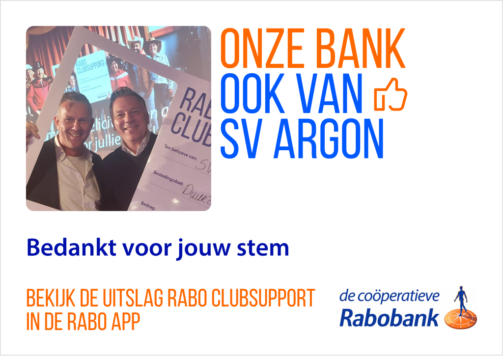 Dankzij alle stemmen tijdens de Rabo ClubSupport actie hebben wij als SV Argon een prachtig bedrag in ontvangst mogen nemen: € 1.375,20!