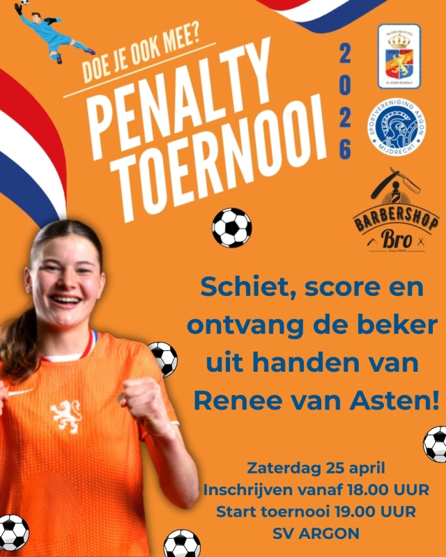 Nog geen twee weken geleden maakte de bij Ajax spelende Renee een droomdebuut voor het Nederlands elftal. Morgen (zaterdag 25 april) is ze in Mijdrecht aanwezig om alle winnaars van het penaltyschieten bij SV Argon Mijdrecht te feliciteren en de bekers te overhandigen!