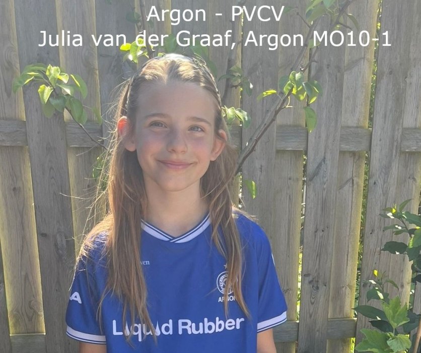 Hoi allemaal! Mijn naam is Julia van der Graaf en ik ben 10 jaar oud. Ik speel in de MO10-1, mijn vader Mark is onze trainer en coach! Ik speel het liefst op het middenveld, net als mijn broer Damian, die voetbalt ook bij Argon en speelt in de JO12-1.